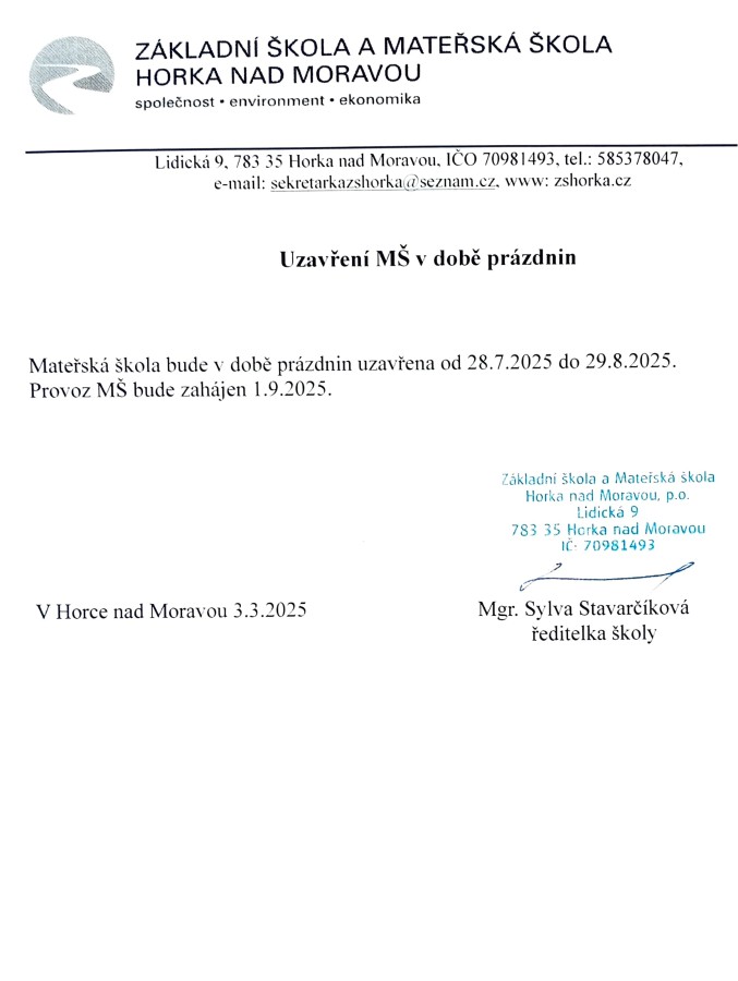 Uzavření MŠ v době letních prázdnin