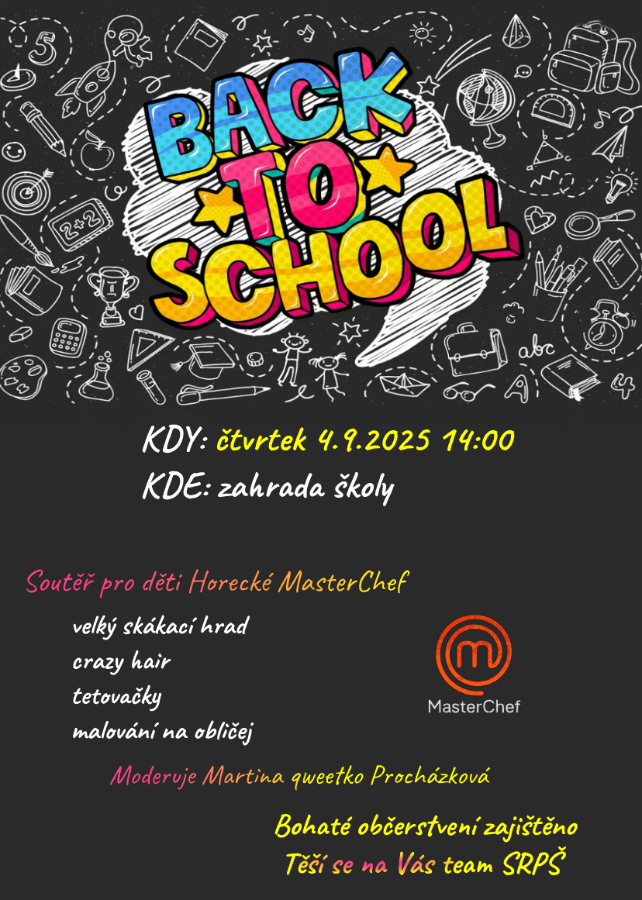 přijďte s námi ve čtvrtek 4. září 2025 od 14,00 oslavit začátek školního roku 2025/2026. Sdružení rodičů připravilo program včetně soutěže Horecké MasterChef.