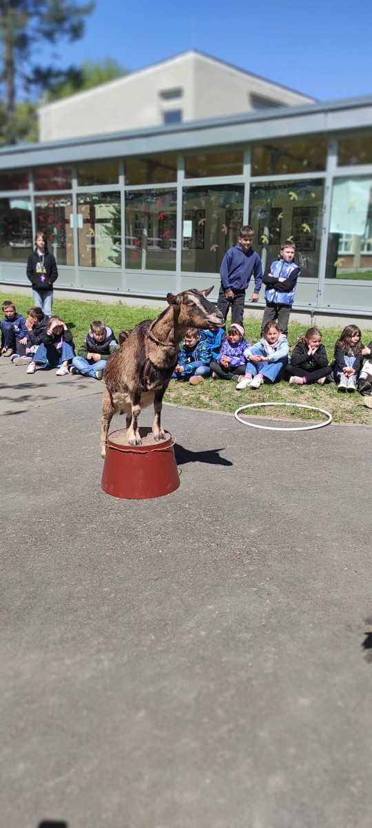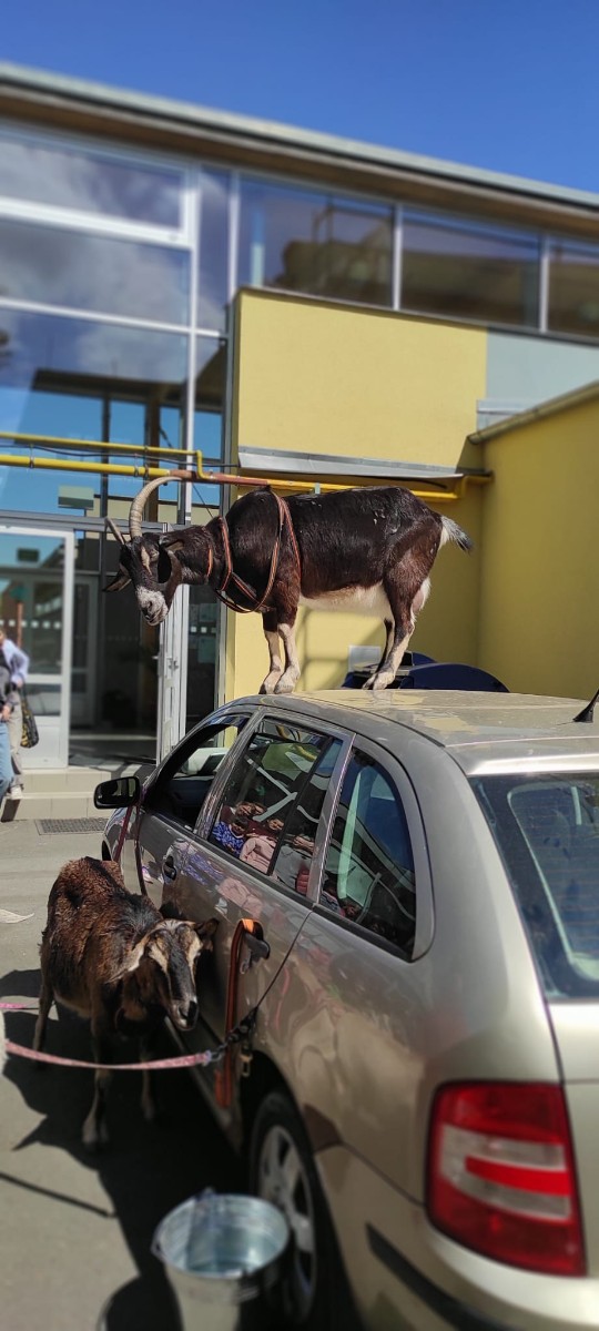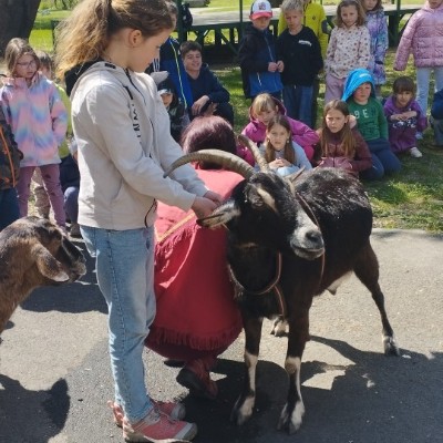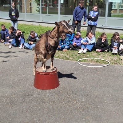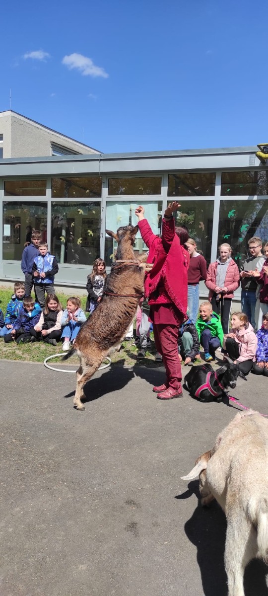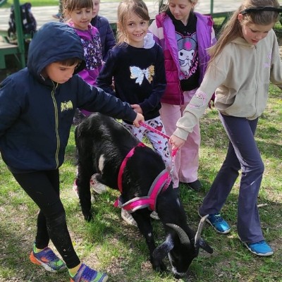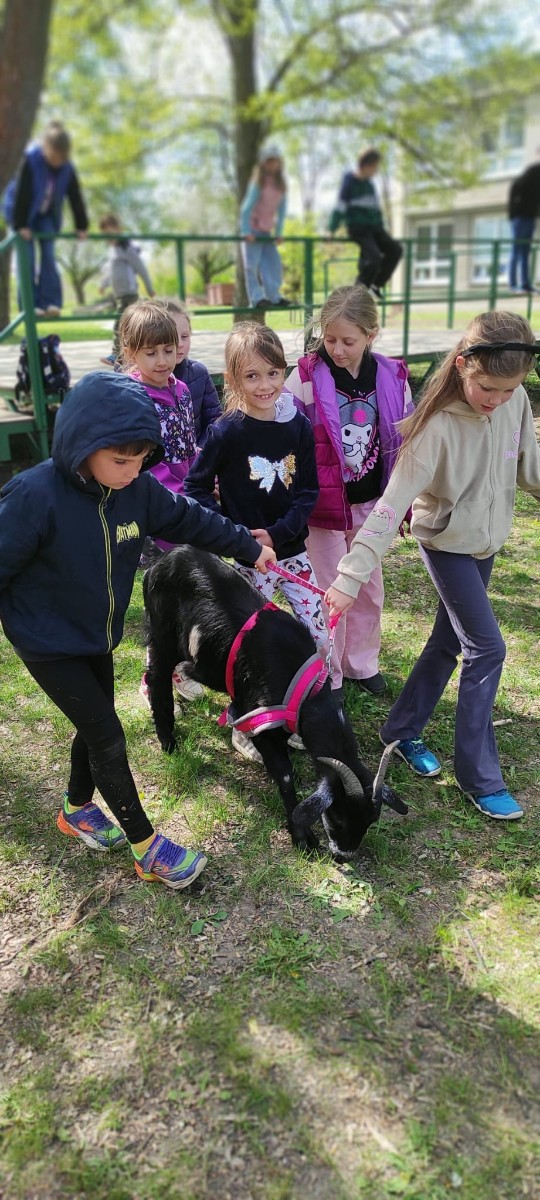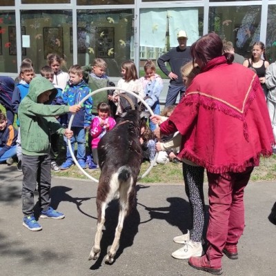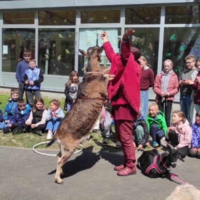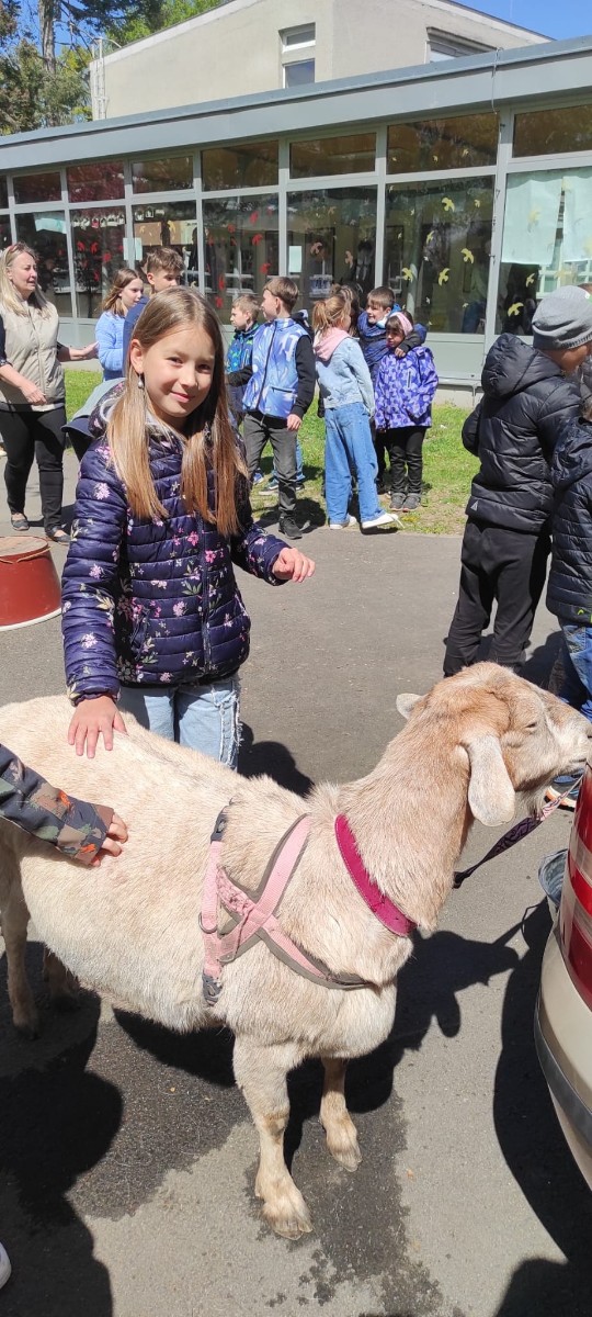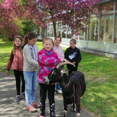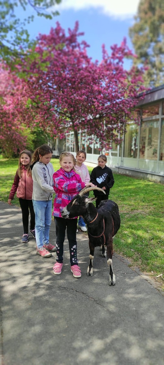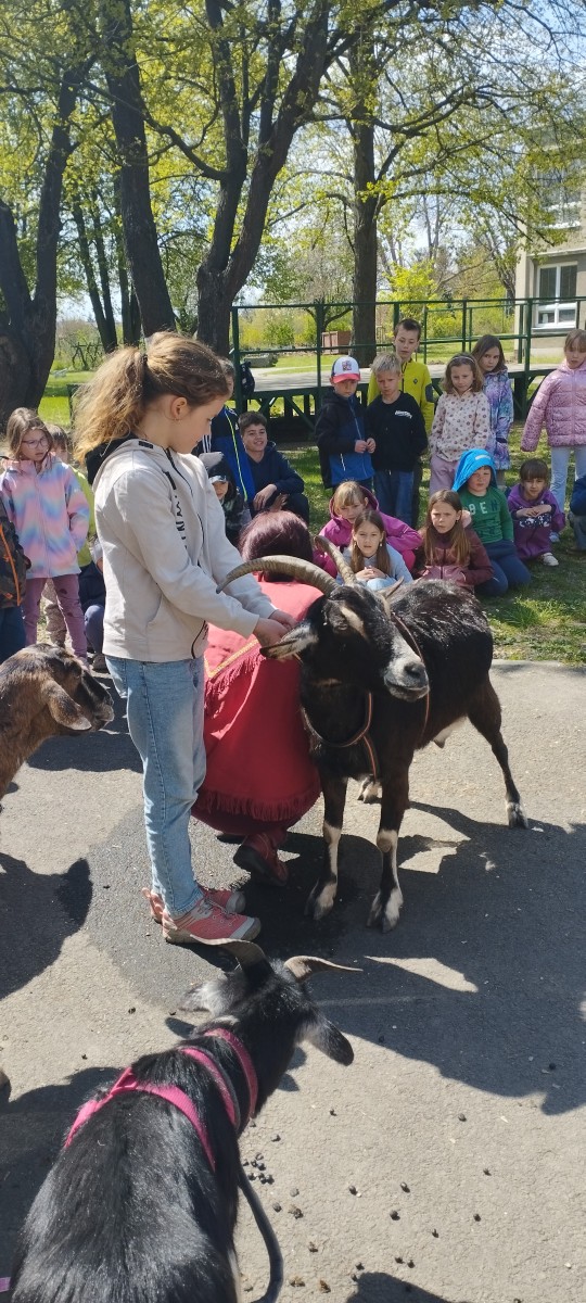 Ve středu 29.4.2026 jsme u nás v družině přivítali vzácnou návštěvu - živé kozy. Přijely k nám čtyři kozí slečny a to sice Elenka, Julinka, Reginka a nejmladší Zuzanka. Jedna z nich se dokonce pyšnila titulem "Miss koza". Program byl pestrý, děti se dozvěděly spoustu zajímavých informací ze zvířecí říše koz - co kozy jedí, jak správně kozu hladit, jak se koza dojí a zda je čerstvě nadojené mléko teplé, proč mají rohy jen některé kozy a může se i koza naučit reagovat na povely jako pes? O tom, že koza zvládne nejen povely, ale i tanec při hudbě se následně děti mohly přesvědčit na vlastní oči, stejně tak jako o tom, že koza úplně bez problému vyskočí a zatančí i na střeše automobilu.