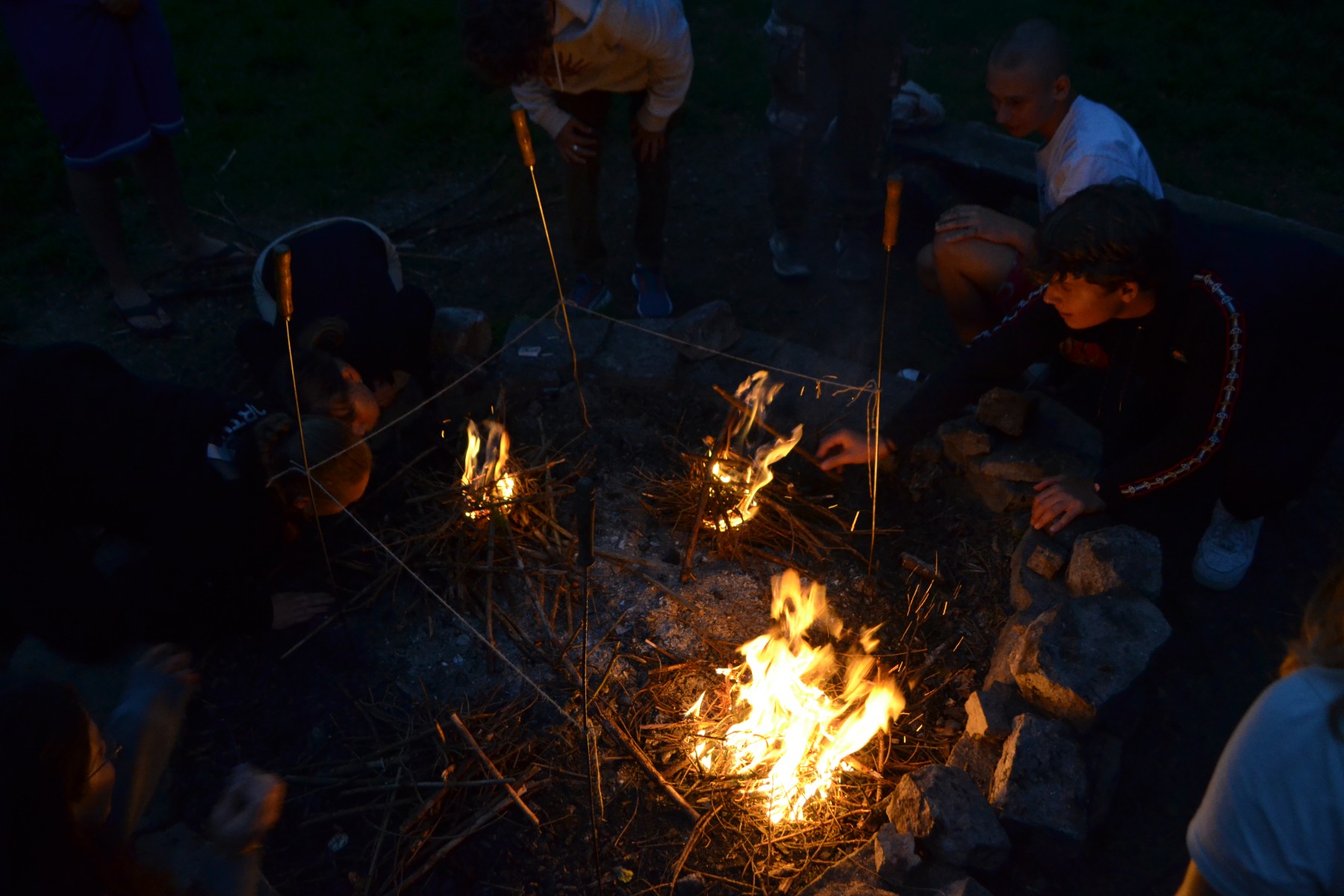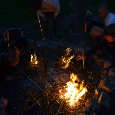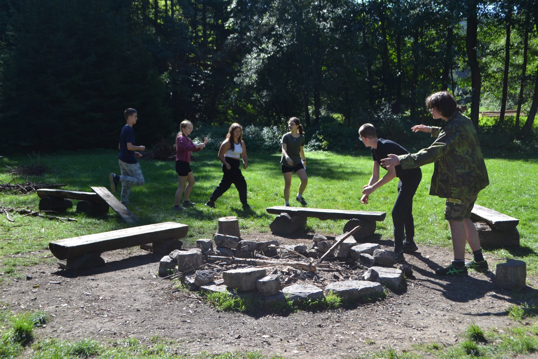 Hned po příjezdu jsme si mohli nechat pouze 2 kila ze všech našich věcí. V ten moment jsme byli dost překvapení, ale teď zpětně si myslíme, že nám to vlastně pomohlo si uvědomit, kolik nepotřebných věcí jsme si s sebou brali. Poté, co jsme se trochu rozhlédli po okolí, jsme byli rozděleni do čtyř kmenů: oheň, voda, země a vzduch. Následovala týmová porada a vytváření kmenové vlajky a pokřiku. Celý zbytek odpoledne jsme mezi sebou v týmech soutěžili v různých aktivitách, jako například: kdo nasbírá co nejvíce dřeva nebo komu se povede nejrychleji zapálit oheň, a tím přepálit provázek. Večer, když už se setmělo, jsme hráli hru jménem slunovrazi. Všichni jsme se náhodným losováním rozdělili na dvě družstva: na slunovrahy a na ochránce světla. Úkolem ochránců bylo přenést zapálenou svíčku z jednoho konce tábora na druhý a slunovrazi se naopak snažili svíčku sfouknout a tím jim to překazit. Hru jsme si všichni moc užili a bylo nám líto, že jsme si ji nemohli zahrát vícekrát. Na závěr dne se postupně každý tým odebral na kmenovou radu, kde společně vyhodnotili, co se jim přes den dařilo, co naopak ne a proč. Ještě proběhlo zvolení nejužitečnějšího člena kmene, a pak jsme se odebrali do chatek pořádně se vyspat.