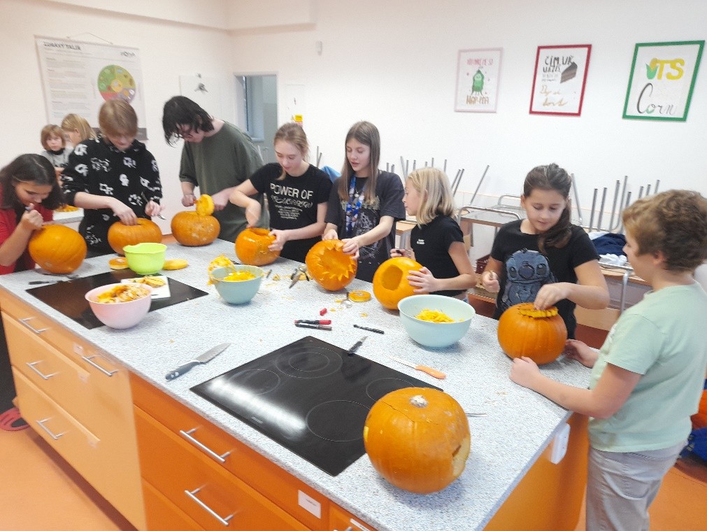 I když se běžně setkáváme ve čtvrtky, odhlasovali si členové Akčního týmu, že spolu strávíme odpoledne i v úterý 31. 10. Společně jsme pak vyřezávali dýně, abychom oslavili Halloween a nasáli tu pravou podzimní atmosféru. Někteří přivedli i kamarády, takže jsme si akci užili v hojném počtu. Pár dýní zůstalo ve škole, většinu si žáci odnesli s sebou domů.