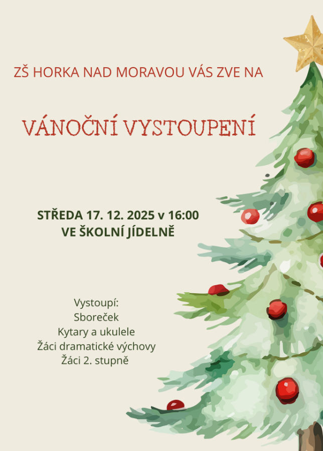 Milí žáci, vážení rodiče, srdečně vás zveme ve středu 17. prosince 2025 od 16:00 na Vánoční vystoupení žáků. Přijďte se s námi naladit na kouzelnou vánoční atmosféru.