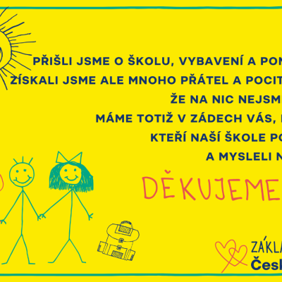 Vážení rodiče, žáci i přátelé školy, velmi děkujeme za Vaši spolupráci při podpoře zatopené školy v České Vsi na Jesenicku. Během několika týdnů se v naší škole vybrala částka 20.000,-. Tato byla odes...