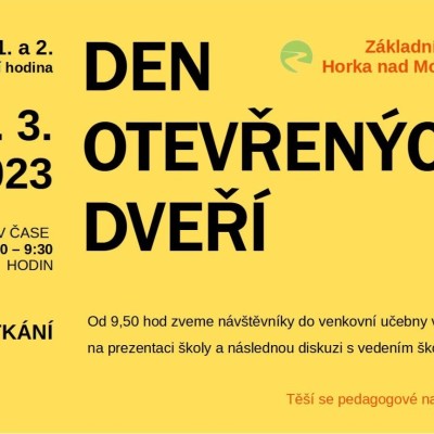 V úterý 14. března 2023 bude ve všech třídách bude otevřená výuka 1. a 2. vyučovací hodinu. Začátek v 7,50 hod v příslušné třídě. Od 9,50 hod zveme návštěvníky do venkovní učebny v areálu na prezentac...
