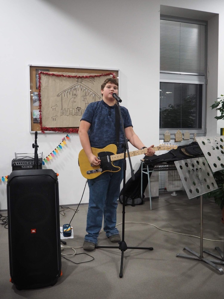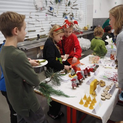 Ve čtvrtek 15. prosince se školní jídelna nezavřela po posledním dojedeném obědě. Za pomoci žáků z devátých ročníků a dekorací vyrobených ve výtvarné výchově se proměnila v tržiště, na kterém se konal vánoční jarmark.